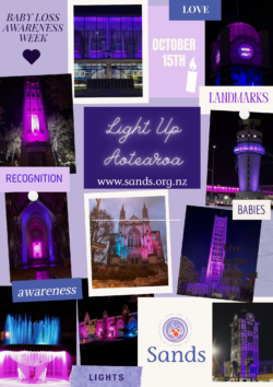 For the past few years, Sands NZ has organised for landmarks across Aotearoa to be lit up in blue, pink and purple for Baby Loss Awareness Week. We thank the councils, organisations, and businesses who participate to raise awareness of pregnancy and baby loss and acknowledging the whānau in their area who have suffered such a heart-breaking loss. The participating landmarks are: