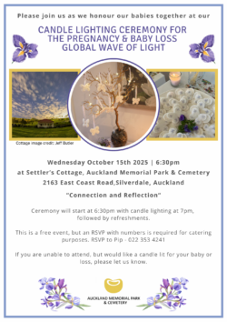 Celebrant Kelly Townsend and Pip from Auckland Memorial Park & Cemetery, are proud to host a free Wave of Light Remembrance Ceremony with those who are grieving a baby lost during pregnancy or after birth. This will be a special evening of peace, love and remembrance to honour and remember all loved and longed for babies gone too soon.